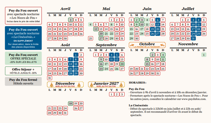 Consultez le programme des spectacles sur www.puydufou.com et sur l’application mobile du puy du Fou, la veille de votre visite.