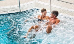 - Bassin multifonctions d’eau de mer chauffée à 32°c de 120 m² chauffée à 31°C équipé de : 4 lits bouillonnants, 2 nages à contre-courant, une plaque bouillonnante, une lame de cobra, 2 pédi-jets doubles, 4 massages séquentiels quadruples, un bain à remous avec sièges massants et sièges, hammam et sauna.